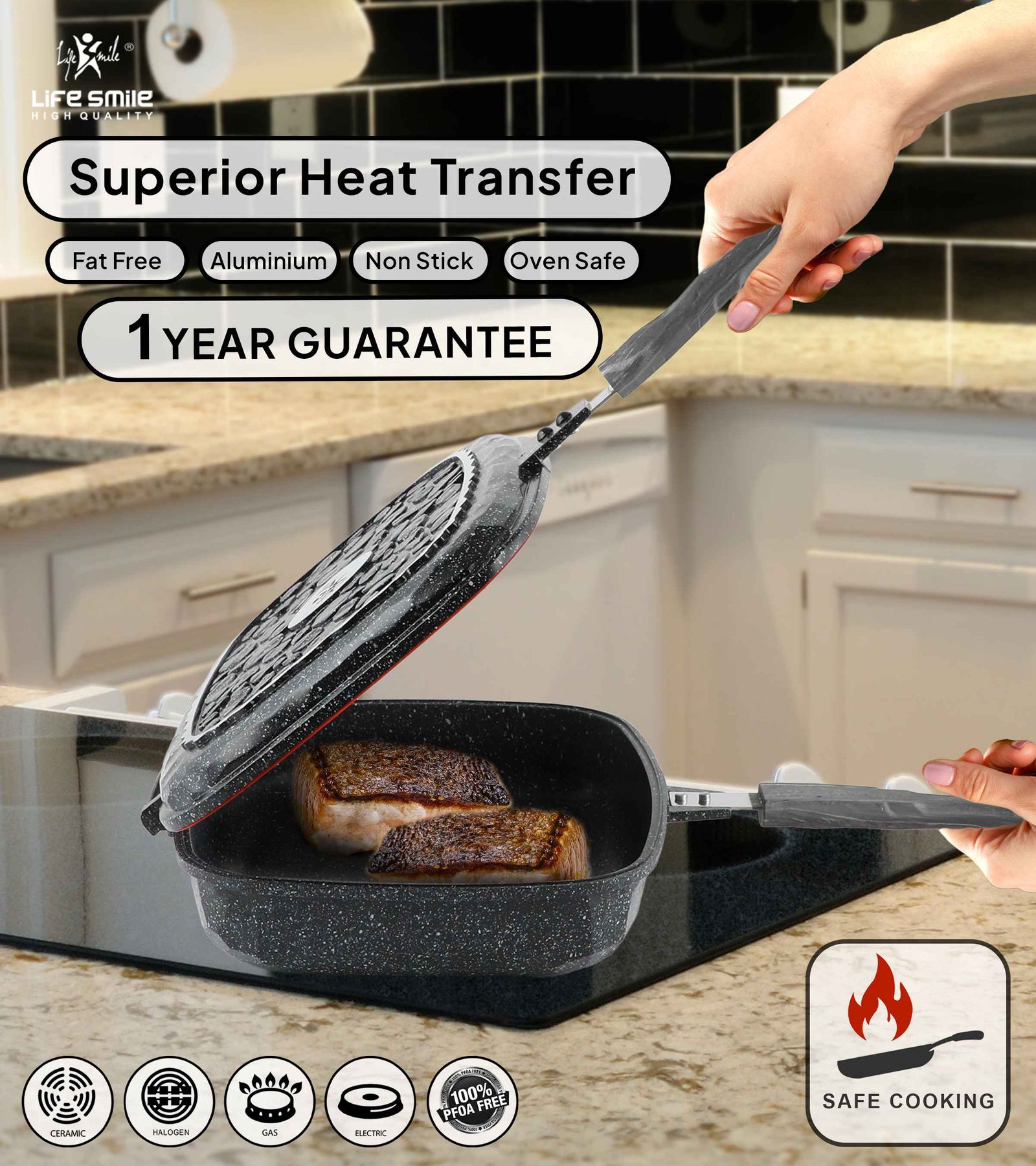 تابه دوطرفه لایف اسمایل یکی از محصولات با کیفیت شرکت معروف لایف اسمایل میباشد . سایز این تابه زیبای دو طرفه 32 میباشد که میتوانید حجم زیادی از غذاهارو سرخ کنید یا بپزید.