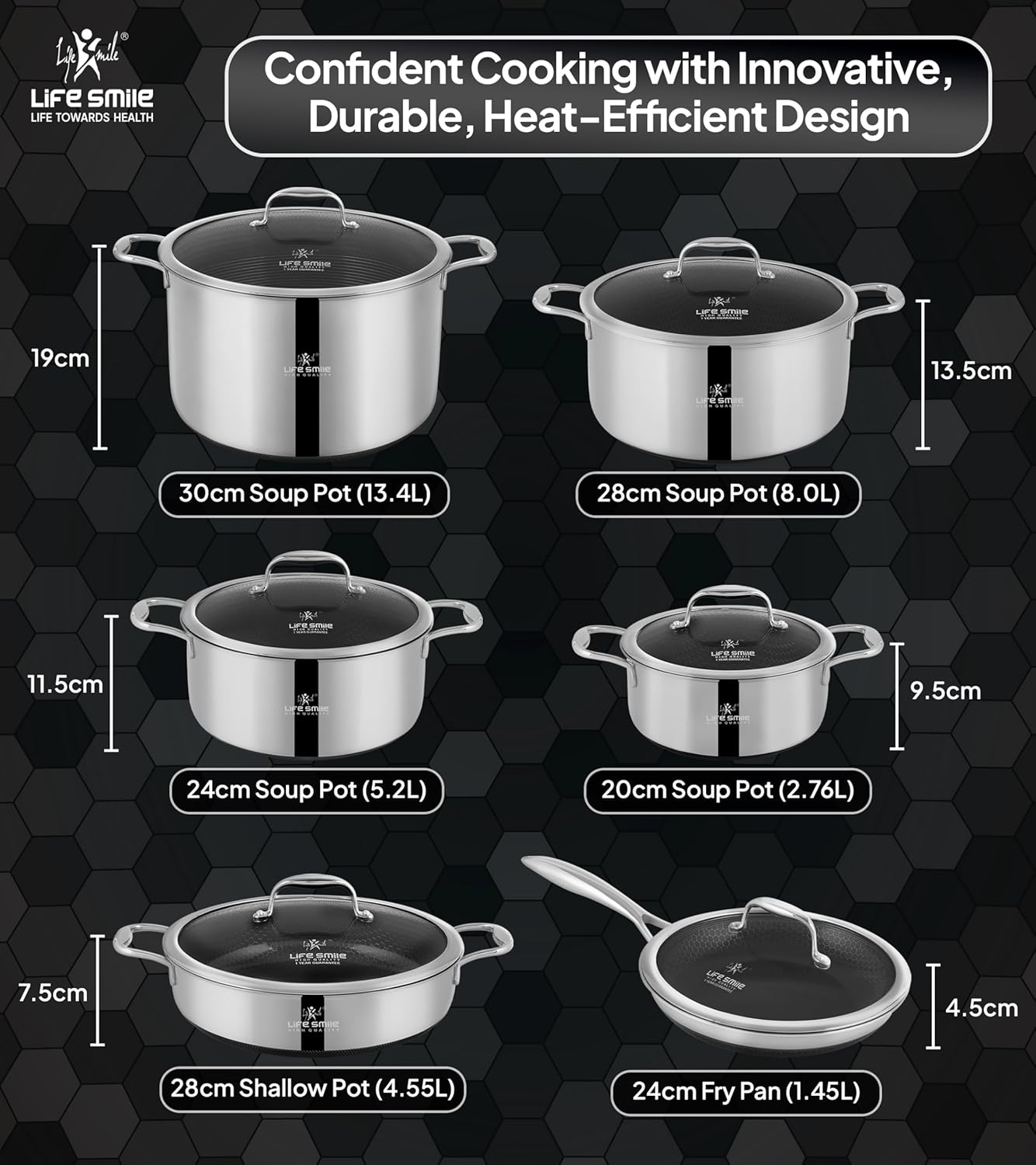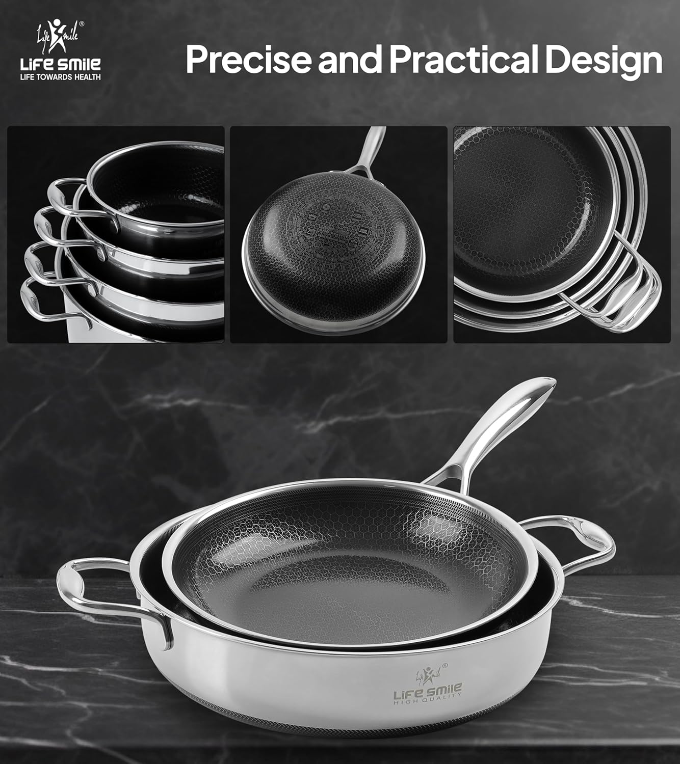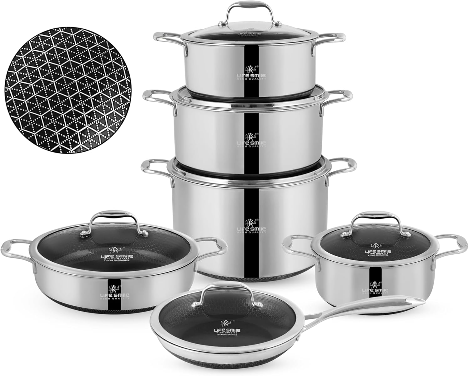 فناوری پیشرفته LIFE SMILE: نچسب و ضد خش. سرویس پخت و پز نچسب ما با داشتن یک پوشش نچسب پیشرفته و طراحی سطح زنبوری، عملکرد نچسبی بادوامتر و برتر را ارائه میدهد. دیگر نگران کنده شدن یا پوسته پوسته شدن نباشید، این سرویس دوام فوقالعادهای دارد و برای مقاومت در برابر استفاده از ظروف فلزی طراحی شده است. ۱۰۰٪ ضد خش.