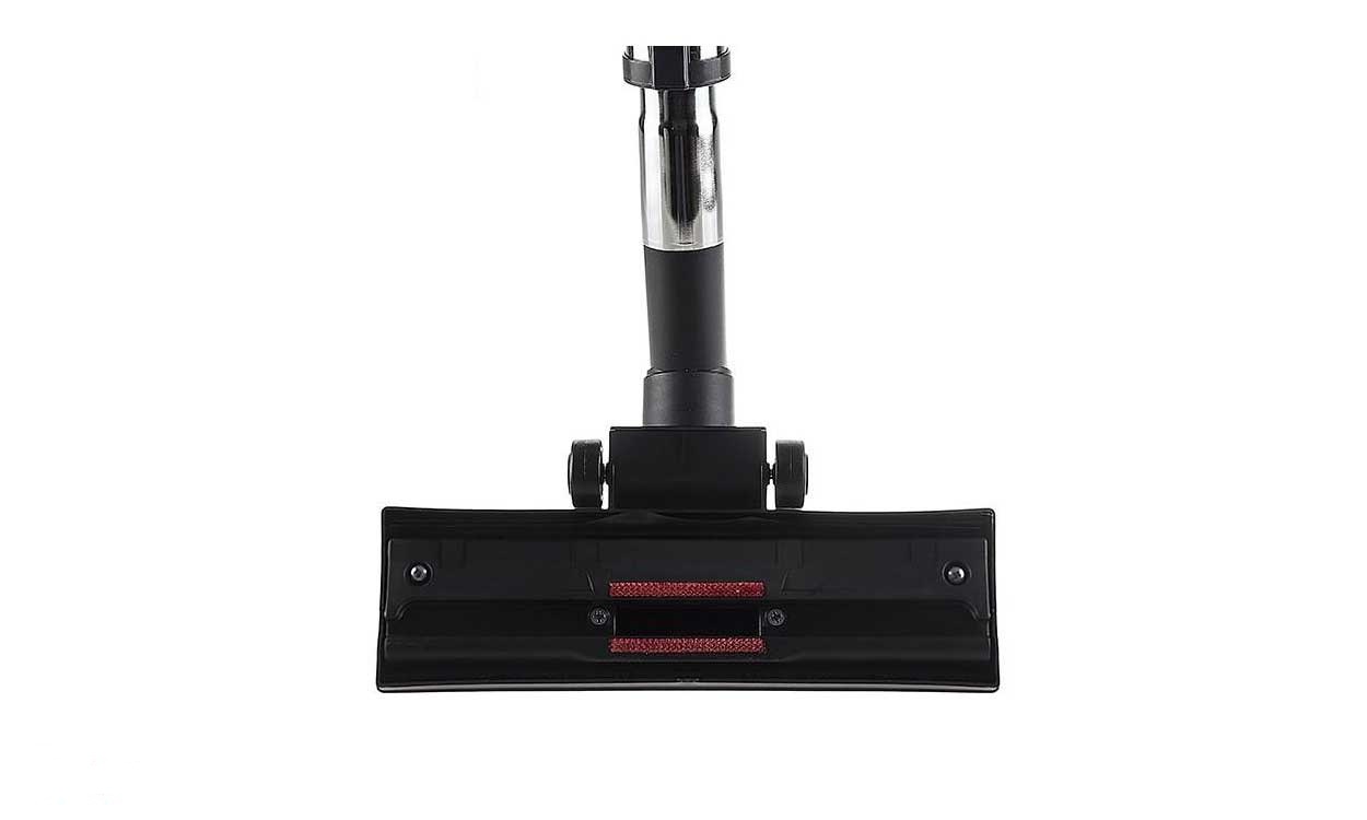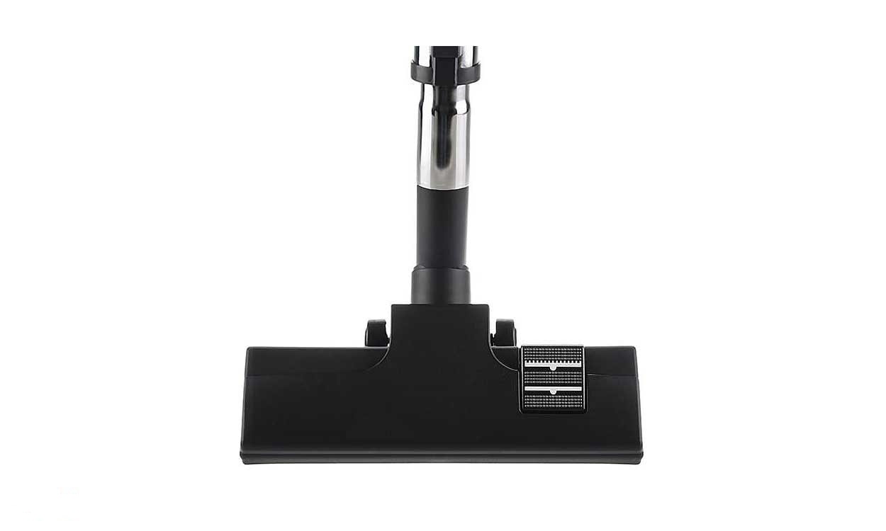 در زیر دستهی این جاروبرقی جای گذاشتن ضمائم دستگاه قرار دارد. به واسطهی داشتن این قسمت ضمائم دستگاه همیشه در دسترس می باشد و همچنین به صورت منظم در کنار دستگاه قرار می گیرد. ضمائم دستگاه شامل یک سری جهت جارو کردن گوشه ها و یک سری برس دارد جهت جارو کردن مبل می باشد.