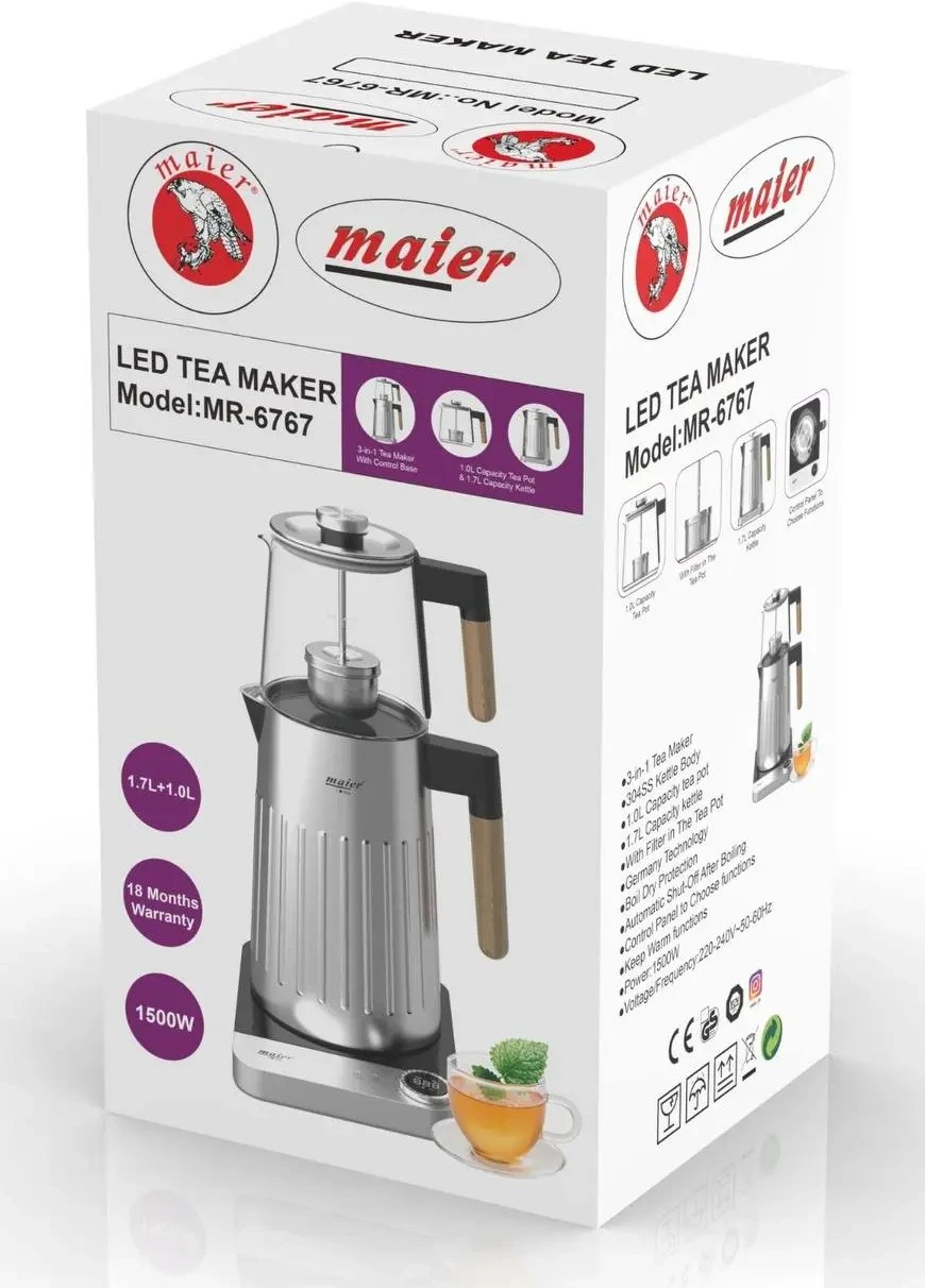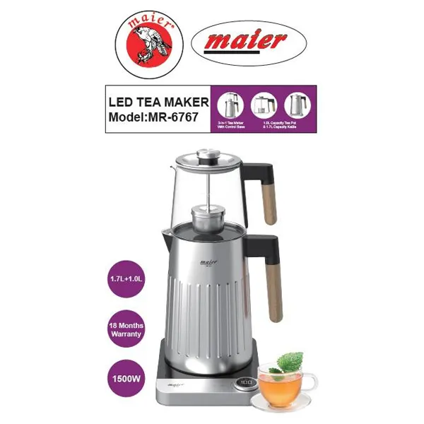 چای ساز مایر مدل MR-6767 یکی از محصولات باکیفیت و کارآمد این برند معتبر است که برای عاشقان چای طراحی شده است. این دستگاه با ترکیبی از طراحی مدرن و عملکرد عالی، به شما این امکان را میدهد که در کمترین زمان ممکن چای خوشعطر و طعمی را آماده کنید. ظرفیت مناسب کتری این چای ساز، امکان تهیه چای برای چند نفر را به راحتی فراهم میکند. همچنین، توان بالای این دستگاه به شما کمک میکند تا آب را سریعتر به جوش بیاورید و از انتظار طولانی برای تهیه چای جلوگیری میکند .